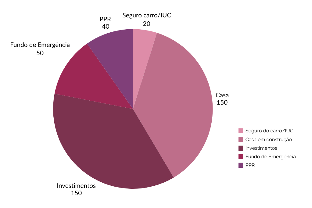 A poupança estimada para os próximos tempos é de cerca de 410€ por mês, e será distribuída da seguinte forma: