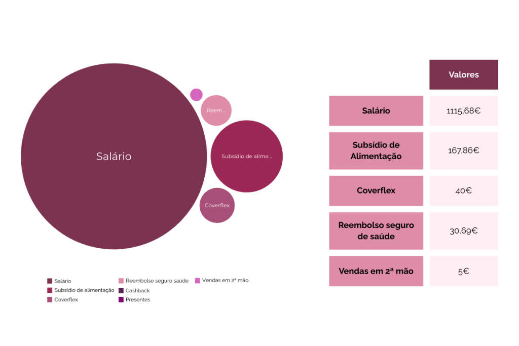 No total, os rendimentos foram de 1359,23€, distribuídos da seguinte forma: