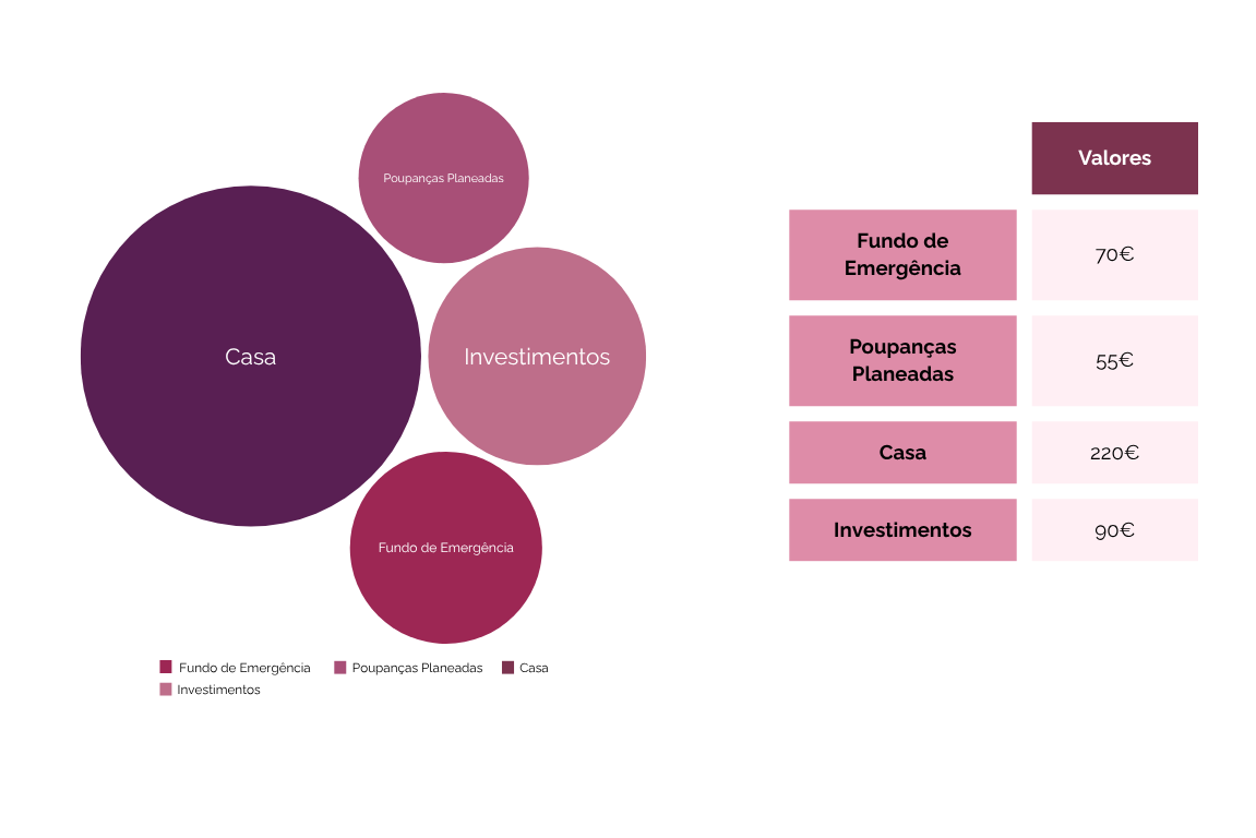 As poupanças e investimentos totalizaram 435€, distribuídos da seguinte forma: